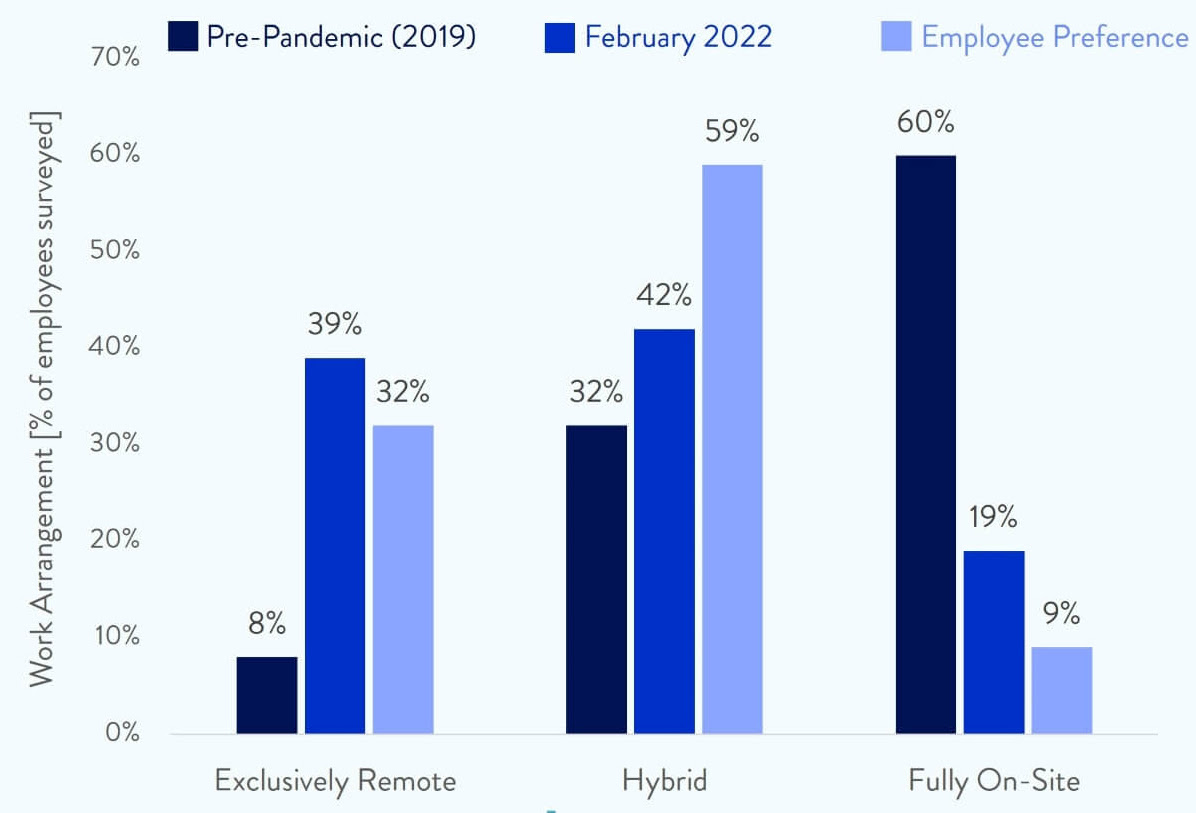 But interestingly, most employees surveyed — 59% to be exact — would actually prefer a hybrid working arrangement, which is more than the 32% that would like to be exclusively remote, and way ahead of the 9% that would like to be fully on-site.